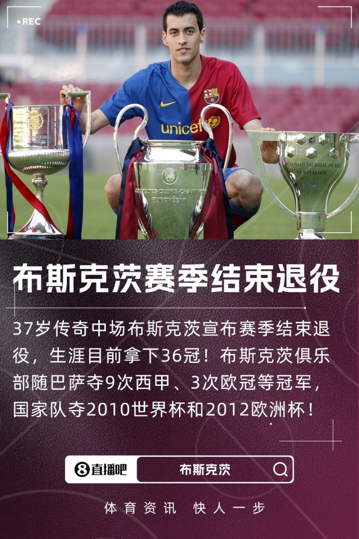 直播吧09月26日讯今日,西班牙/巴萨传奇中场、37岁的布斯克茨宣布赛季结束后退役。