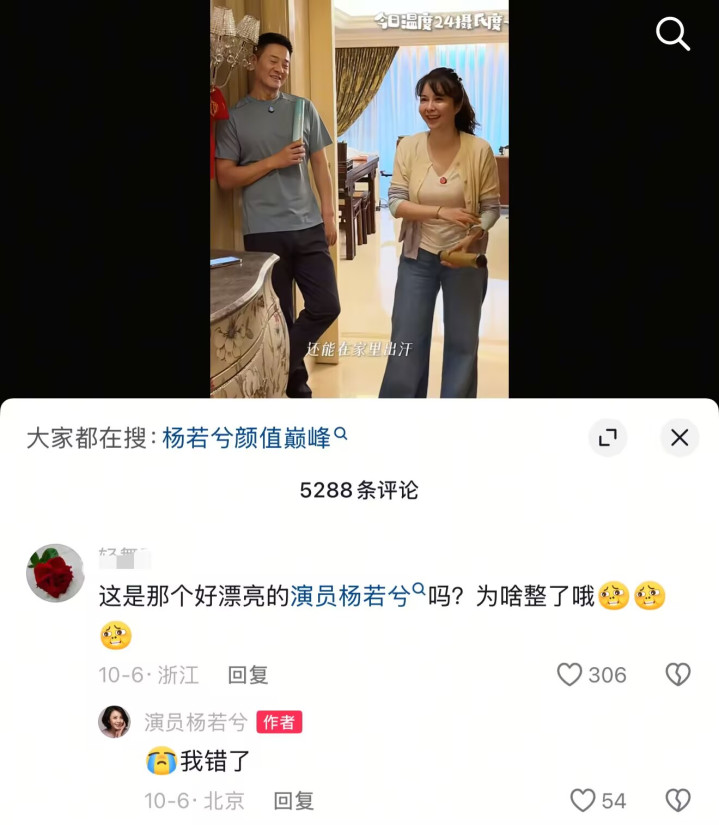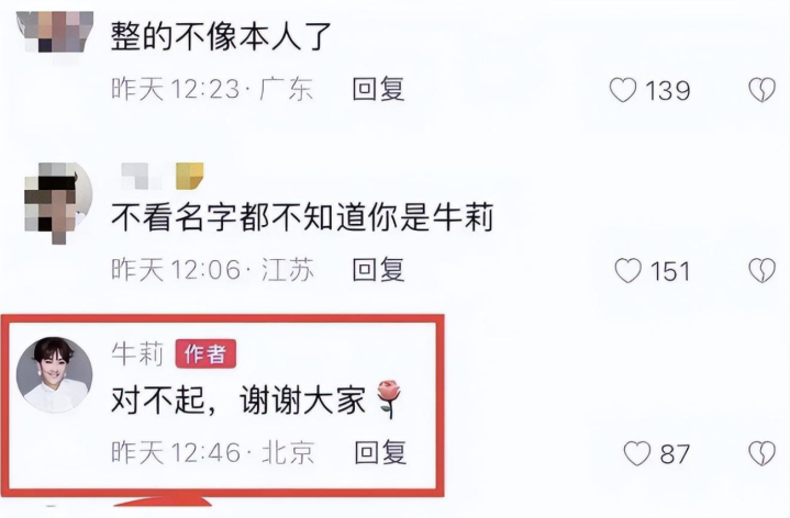 她的社交平台上,不少人都吐槽她整得认不出来了,她曾回复网友:对不起,谢谢大家。