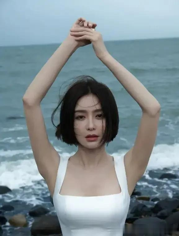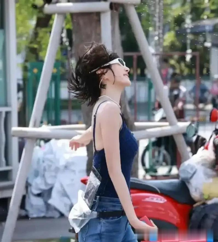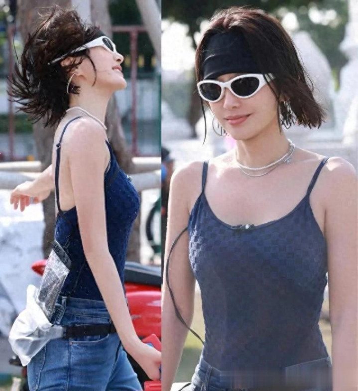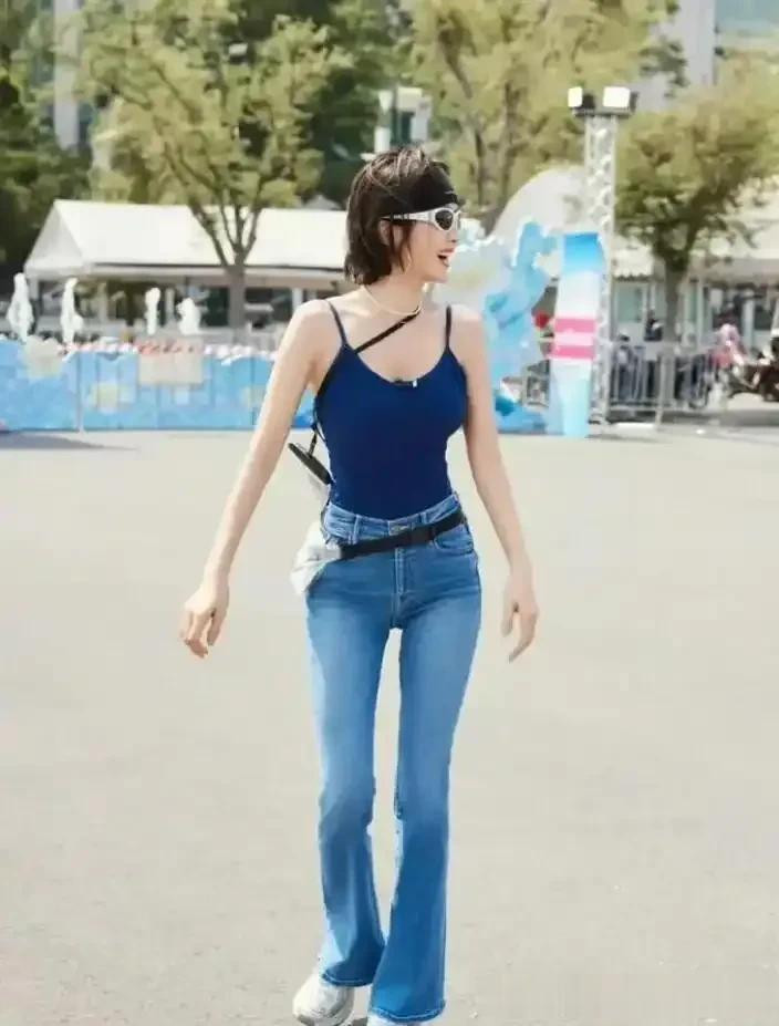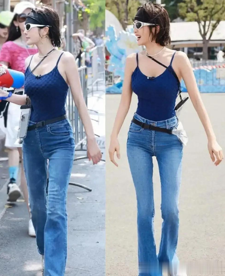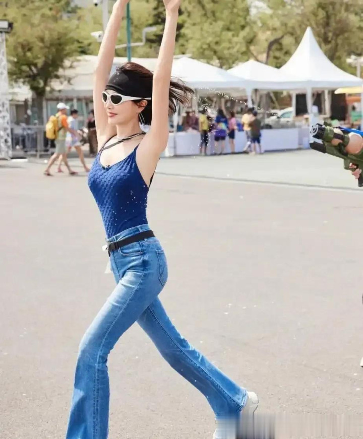 46岁秦岚的湿身照曝光! 好身材穿吊带+紧身裤玩水, 腰臀比很绝!